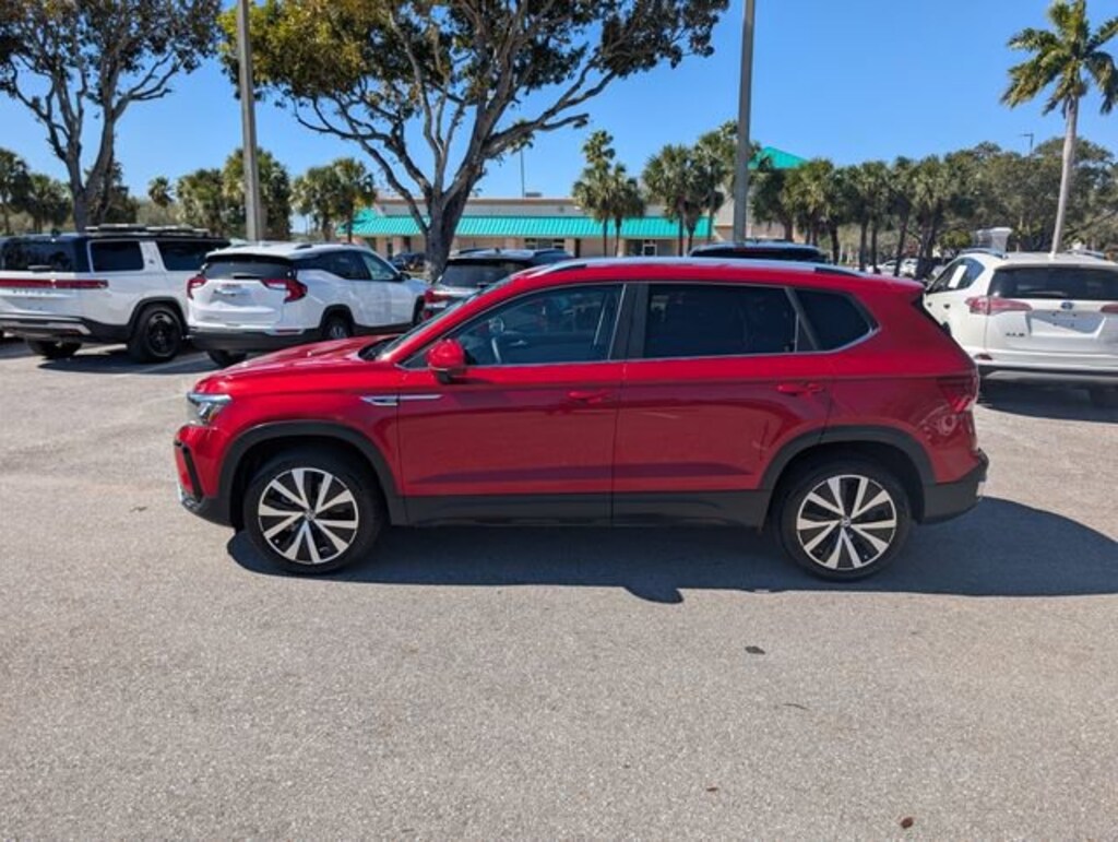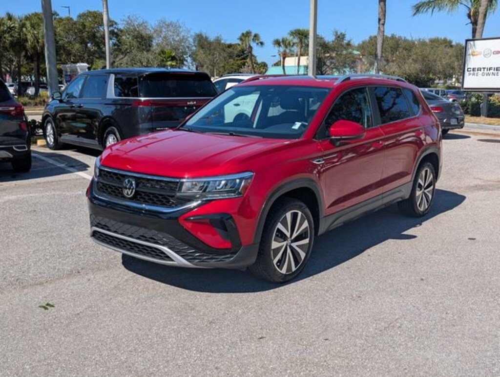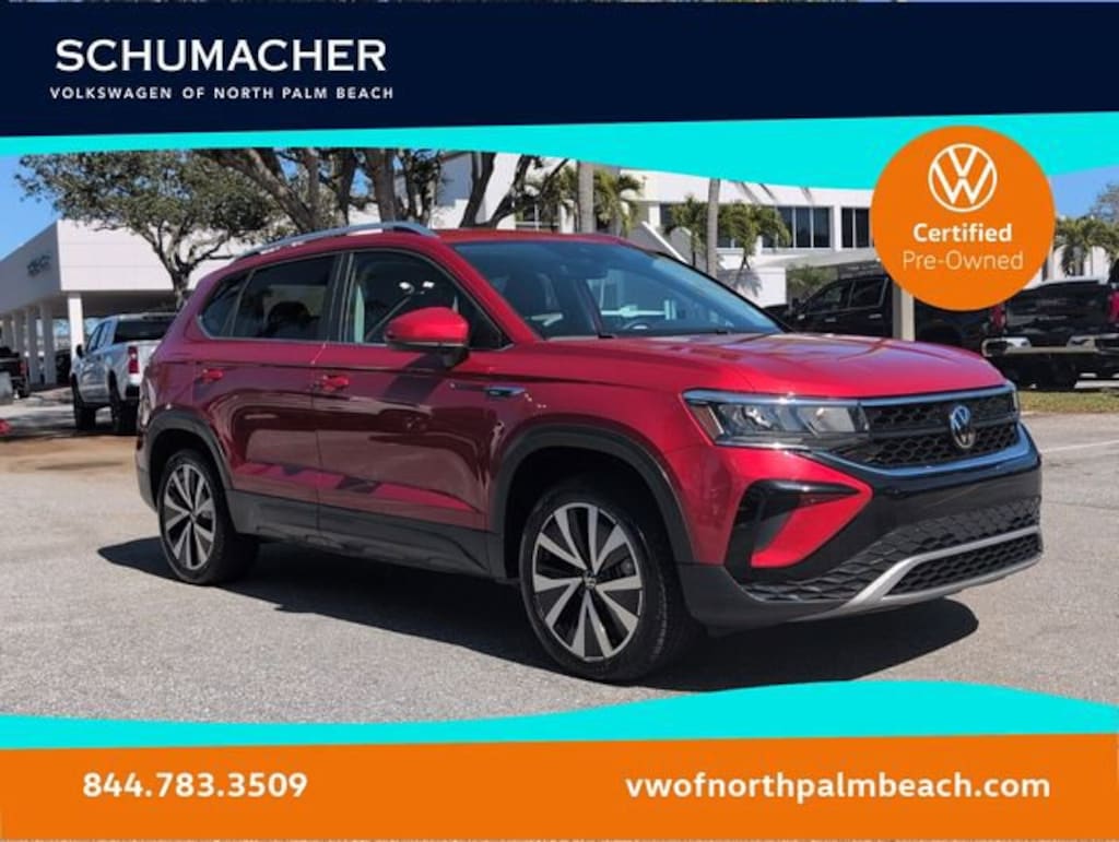 Certified. Kings Red Metallic 2023 Volkswagen Taos 1.5T SE FWD 8-Speed Automatic with Tiptronic 1.5L I4 Turbocharged DOHC 16V LEV3-SULEV30 158hpWE DELIVER TO YOUR HOME OR OFFICE !! Volkswagen Certified Pre-Owned Certified, 3.23 Axle Ratio, 4-Wheel Disc Brakes, 6 Speakers, ABS brakes, Active Blind Spot Monitor, Air Conditioning, Alloy wheels, AM/FM radio: SiriusXM with 360L, Auto High-beam Headlights, Brake assist, Bumpers: body-color, CloudTex & Cloth Seating Surfaces, Compass, Delay-off headlights, Driver door bin, Driver vanity mirror, Dual front impact airbags, Dual front side impact airbags, Electronic Stability Control, Emergency communication system: VW Car-Net Safe & Secure 5-year, Exterior Parking Camera Rear, Front anti-roll bar, Front Bucket Seats, Front Center Armrest, Front reading lights, Front Strut Rear Torsion Beam Suspension, Front wheel independent suspension, Fully automatic headlights, Heated door mirrors, Heated Front Comfort Seats, Heated front seats, Heated steering wheel, Illuminated entry, Leather Shift Knob, Low tire pressure warning, Occupant sensing airbag, Outside temperature display, Overhead airbag, Overhead console, Panic alarm, Passenger door bin, Passenger vanity mirror, Power door mirrors, Power driver seat, Power steering, Power windows, Radio data system, Radio: MIB3 Composition Media AM/FM/HD, Rain sensing wipers, Rear anti-roll bar, Rear seat center armrest, Rear window defroster, Rear window wiper, Remote keyless entry, Roof rack: rails only, Security system, Speed control, Speed-sensing steering, Split folding rear seat, Spoiler, Steering wheel mounted audio controls, Tachometer, Telescoping steering wheel, Tilt steering wheel, Traction control, Trip computer, Variably intermittent wipers, and Wheels: 18 2-Tone Machined Alloy. Odometer is 1623 miles below market average! 28/36 City/Highway MPG