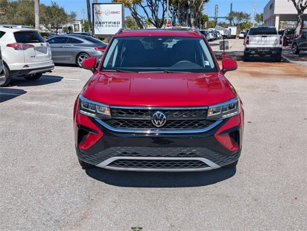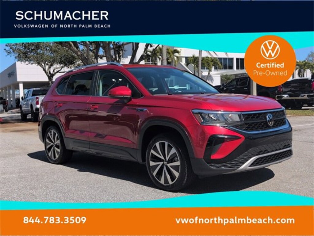 Certified. Kings Red Metallic 2023 Volkswagen Taos 1.5T SE FWD 8-Speed Automatic with Tiptronic 1.5L I4 Turbocharged DOHC 16V LEV3-SULEV30 158hpWE DELIVER TO YOUR HOME OR OFFICE !! Volkswagen Certified Pre-Owned Certified, 3.23 Axle Ratio, 4-Wheel Disc Brakes, 6 Speakers, ABS brakes, Active Blind Spot Monitor, Air Conditioning, Alloy wheels, AM/FM radio: SiriusXM with 360L, Auto High-beam Headlights, Brake assist, Bumpers: body-color, CloudTex & Cloth Seating Surfaces, Compass, Delay-off headlights, Driver door bin, Driver vanity mirror, Dual front impact airbags, Dual front side impact airbags, Electronic Stability Control, Emergency communication system: VW Car-Net Safe & Secure 5-year, Exterior Parking Camera Rear, Front anti-roll bar, Front Bucket Seats, Front Center Armrest, Front reading lights, Front Strut Rear Torsion Beam Suspension, Front wheel independent suspension, Fully automatic headlights, Heated door mirrors, Heated Front Comfort Seats, Heated front seats, Heated steering wheel, Illuminated entry, Leather Shift Knob, Low tire pressure warning, Occupant sensing airbag, Outside temperature display, Overhead airbag, Overhead console, Panic alarm, Passenger door bin, Passenger vanity mirror, Power door mirrors, Power driver seat, Power steering, Power windows, Radio data system, Radio: MIB3 Composition Media AM/FM/HD, Rain sensing wipers, Rear anti-roll bar, Rear seat center armrest, Rear window defroster, Rear window wiper, Remote keyless entry, Roof rack: rails only, Security system, Speed control, Speed-sensing steering, Split folding rear seat, Spoiler, Steering wheel mounted audio controls, Tachometer, Telescoping steering wheel, Tilt steering wheel, Traction control, Trip computer, Variably intermittent wipers, and Wheels: 18 2-Tone Machined Alloy. 28/36 City/Highway MPGVolkswagen Certified Pre-Owned Details:* Roadside Assistance* Vehicle History* Model Year 2020 and Newer Vehicles: 2-Year or 24,000-Mile (whichever occurs first) Comprehensive Limited Warranty. Model Year 2019 Vehicles: 1-Year or 12,000-Mile (whichever comes first) Comprehensive Limited Warranty. Electric Vehicles Model Year 2019 & Newer: 3-Year or 36,000-Mile (whichever comes first) Comprehensive Limited Warranty. 2 Years of 24-Hour Roadside Assistance, Three Months of SiriusXM Platinum Plan Trial Subscription.* Warranty Deductible: $50* 100+ Point Inspection